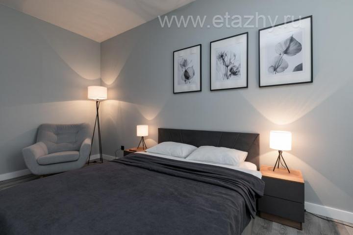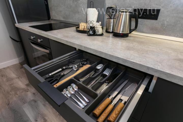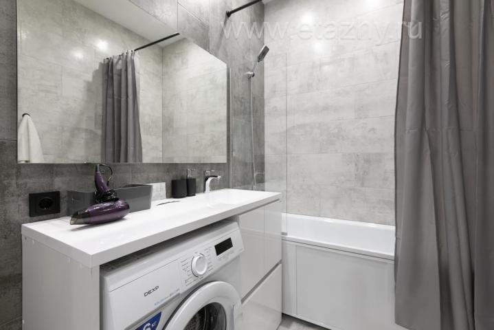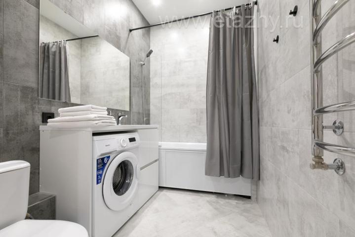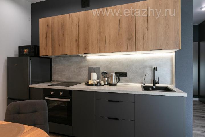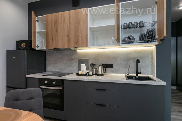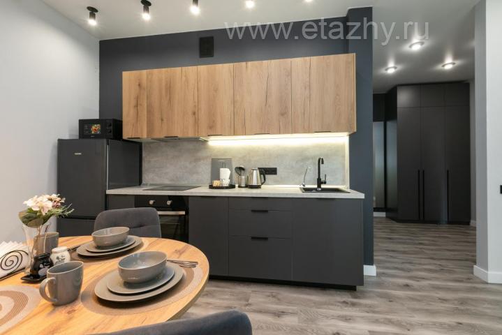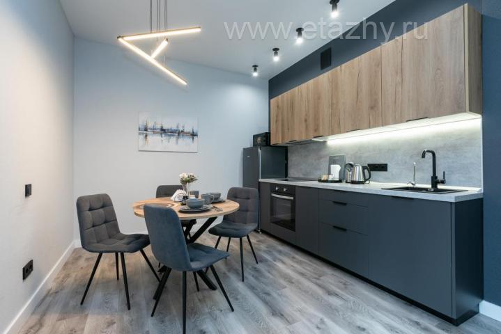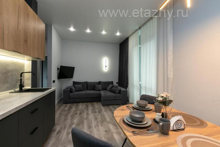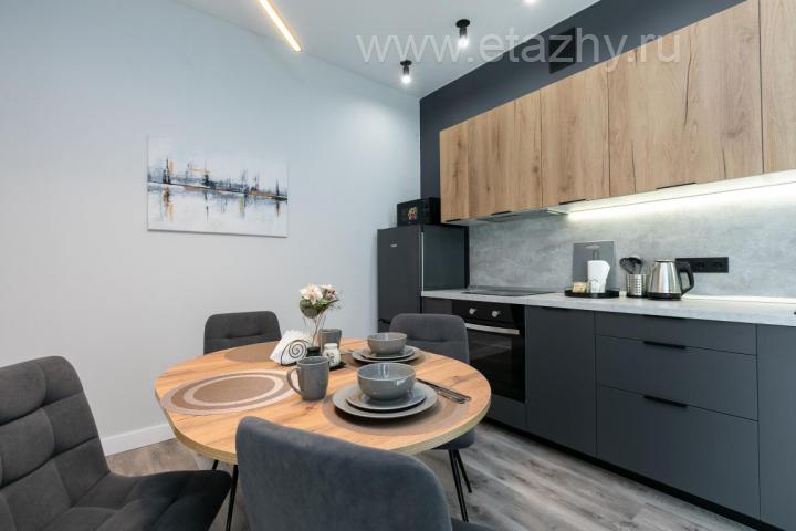 В квартире современный дизайнерский ремонт, комфортная кухня-гостиная с микроволновой печью, духовым шкафом, холодильником, электрическим чайником и варочной поверхностью. Обеденный стол на 4 персоны.