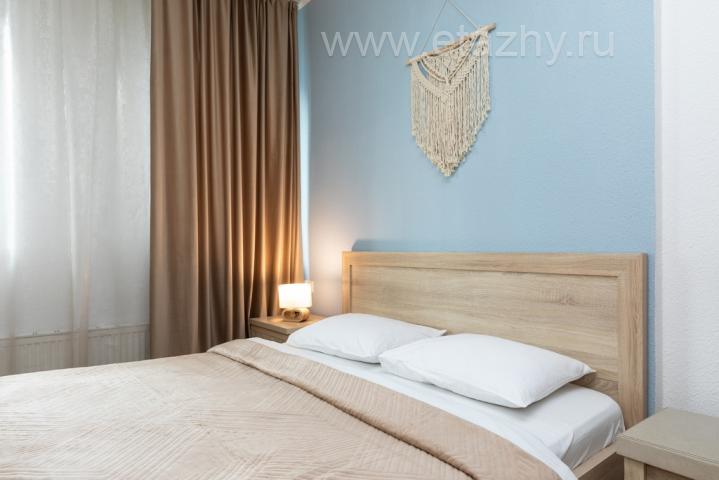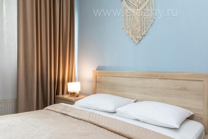 В комнате установлена удобная двуспальная кровать с ортопедическими матрасами и двуспальный диван.